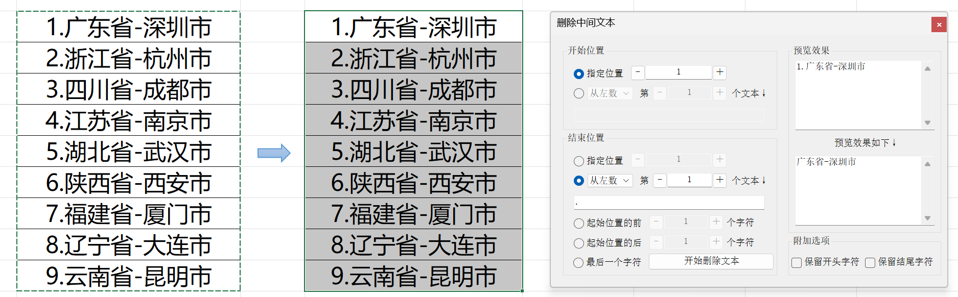指定位置:输入要删除的字符的开始位置,从1开始计数从左数第X个文本:这里需要输入一个整数,表示你从左数第X个文本开始删除,X从1开始计数例:“1.四川省-成都市-成华区”,开始位置为 从左数第1个文本,文本填入的是 “-”,则会从四川省后面这个“-”开始删除