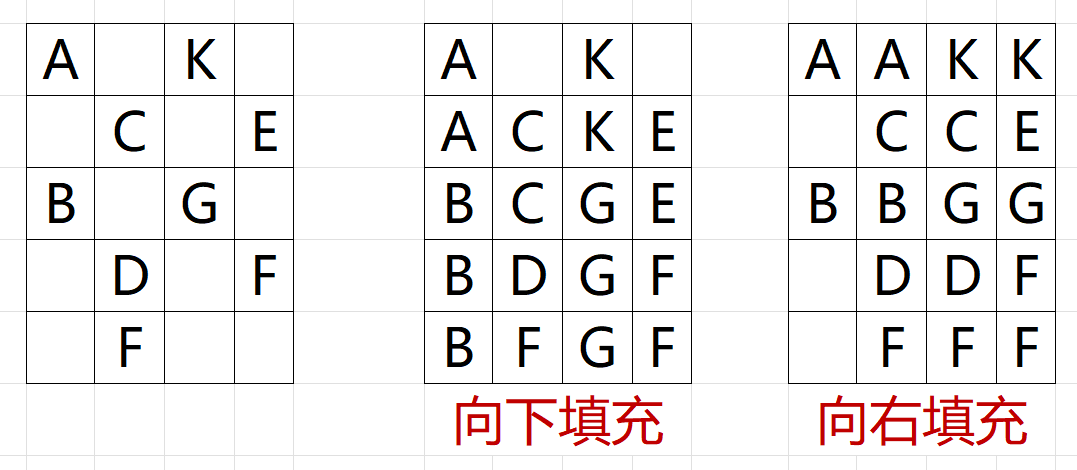 在这个选项卡下,提供了单元格空值填充的功能,主要包括 向右填充 和 向下填充 两种方式,具体实现效果如下: