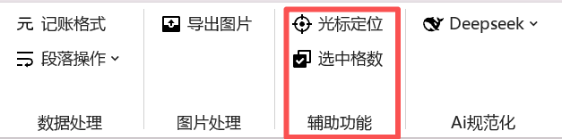 08 辅助功能¶ 在本文中,主要介绍一些辅助功能,你可以在下面这里找到这些功能: 光标定位¶ 这个功能的设置主要在于你往下滑动,需要寻找一个具体的内容,可能往下走了几页或者十几页,然后想要回到之前光标在的位置,又得找老半天,这个功能就可以帮助你快速定位到之前的位置。 选中格数¶ 有的时候你选中了表格的一些区域,然后想看下选中了多少个单元格,这个功能就可以帮助你实现。具体效果如图: (此选项卡目前功能稍少,后续会继续补充,敬请期待!)