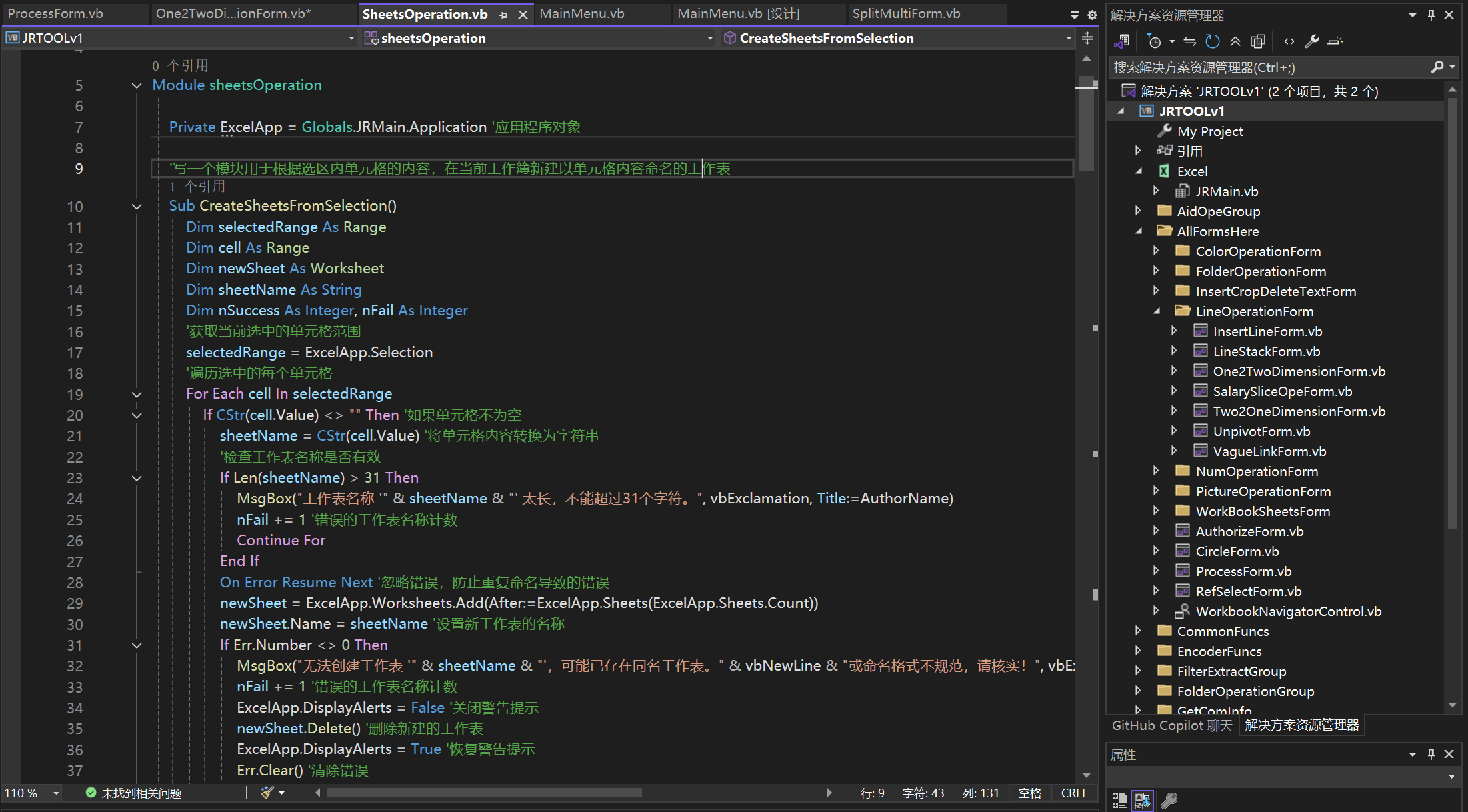 我将自己开发的插件命名为"杰瑞工具箱",EXCEL版本的使用教程放在这里,可以参考,由于版本不断在迭代,自己在后台不断做开发,所以后续具体章节的截图中的组件位置可能会发生变化,但是整体功能都在,下面是VSTO的后台开发截图: