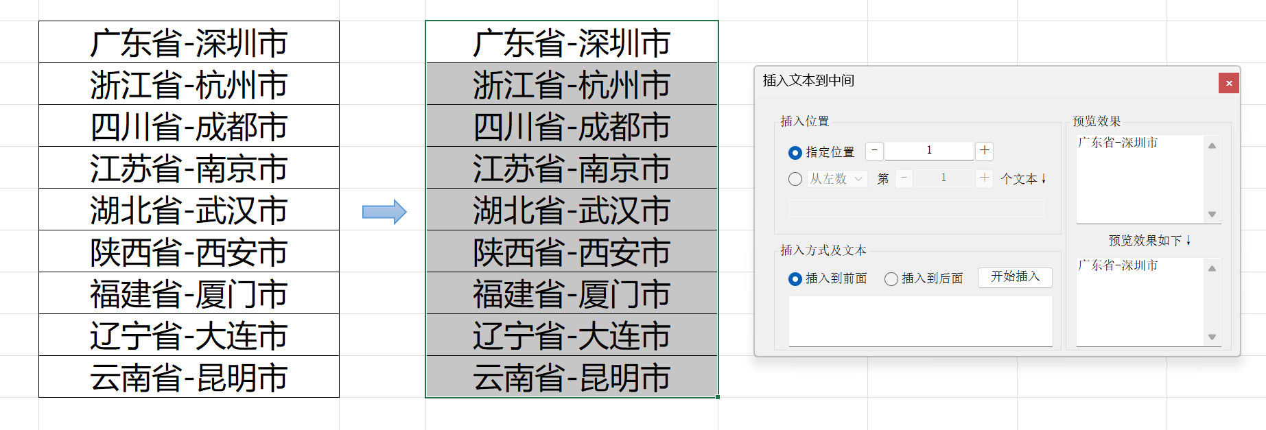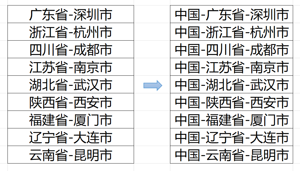 对于要插入到开头的字符串,我们可以使用 开头插入 功能,比如我们在开头插入“中国-”,插入处理前后效果对比: