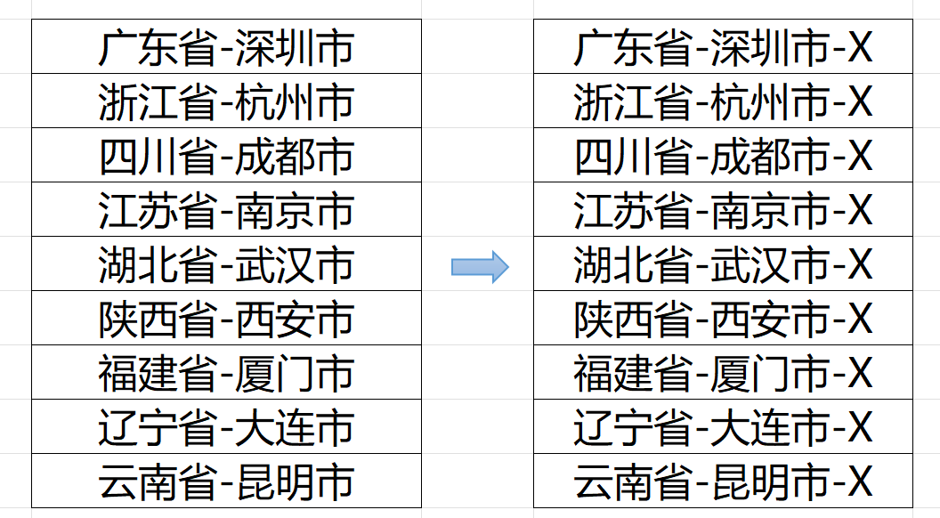 对于要插入到结尾的字符串,我们可以使用 结尾插入 功能,比如我们在结尾插入“-X”,插入处理前后效果对比: