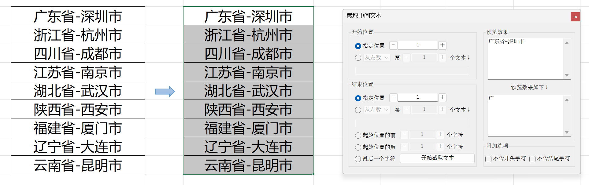 从右数第X个文本:这里需要输入一个整数,表示你从右数第X个文本开始截取,X从1开始计数例:“1.四川省-成都市-成华区”,开始位置为 从右数第1个文本,文本填入的是 “-”,则会从成都市后面这个“-”开始截取