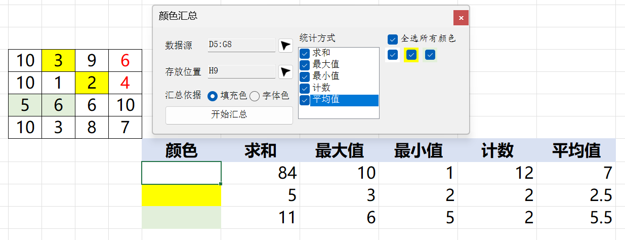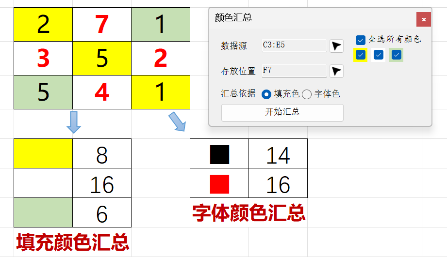 数据源:指的是你要统计的数值区域,一般是一个矩形区域所选颜色:只有勾选了的颜色才会进行求和,目前支持最多20个颜色存放位置:选择要存放区域的 第一个单元格 位置即可汇总依据:指的是你需要对不同单元格底色中的数值进行加和,还是不同字体颜色中的数值进行加和