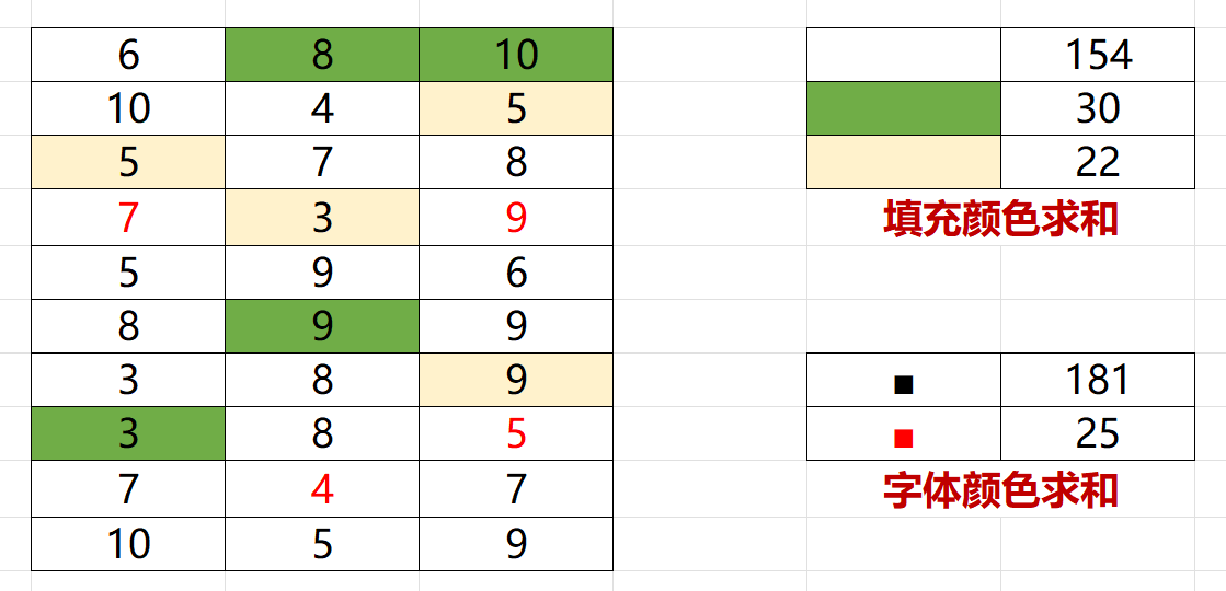 通过此功能,你可以对不同单元格底色中的具体数值进行加和或者不同字体颜色中的数值进行加和,实现如下的效果: