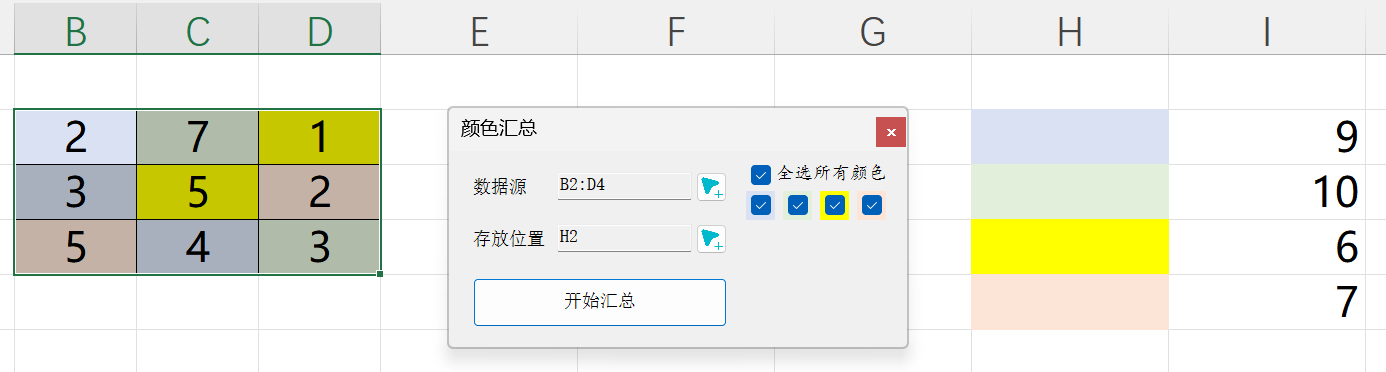 07 单元格颜色操作¶ 一、单元格颜色统计¶ 通过此功能,你可以对不同单元格底色中的具体数值进行加和,实现如下的效果: 参数解释: 数据源:指的是你要统计的数值区域,一般是一个矩形区域 所选颜色:只有勾选了的颜色才会进行求和,目前支持最多20个颜色 存放位置:选择要存放区域的 第一个单元格 位置即可