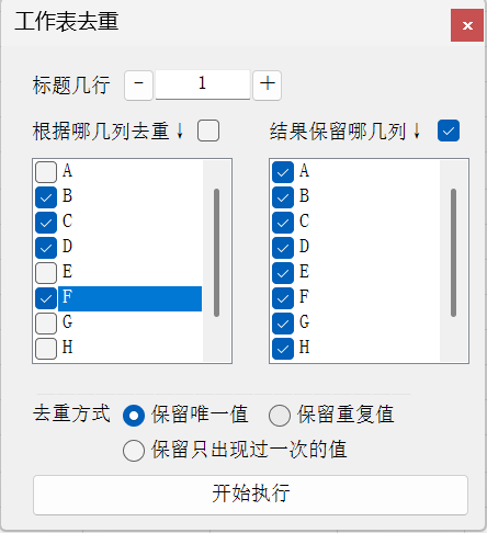 这个选项卡提供了你去重的功能,你可以选择去重的列,可以是单列也可以是多列,也可以选择要保留哪些列,去重后会在当前工作簿中新建一个sheet,sheet名为 唯一值,并在该sheet中展示去重后的结果,具体功能界面如下: