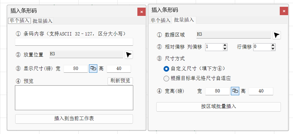 数据区域:选择你要插入的条形码编号区域相对偏移:根据需要设置插入的条形码与数据区域的相对偏移量,默认偏移1列,即条形码插入到右侧显示尺寸:自定义尺寸下,默认2:1的比例,操作和插入单张相同,另外也可以根据单元格自适应调整