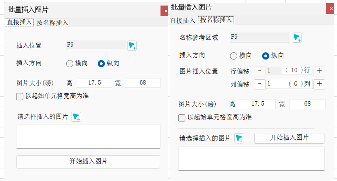 名称参考区域:即你要插入的图片根据哪一列或者哪一行进行匹配插入方向:横向是从左到右,纵向是从上到下图片插入位置:如果 插入方向选择的横向,则默认选择行偏移多少行,图片会在名称参考区域的上面X行或者下面X行插入;如果 插入方向选择的纵向,则默认选择列偏移多少列,图片会在名称参考区域的左边X列或者右边X列插入图片宽高:可以根据需要设置图片的宽度和高度(单位为磅),也可以勾选以起始单元格为基准,即图片的宽度和高度会根据起始单元格的大小自动调整,注意设置宽高之后可能会改变原有图片的宽高比例选择待插入的图片:点击选择待插入的图片,会弹出文件选择窗口,选择需要插入的图片即可(可多选)文件名匹配规则:目前仅支持全名匹配,即图片文件名和选区中的内容完全一致时,才会插入该图片,否则为空