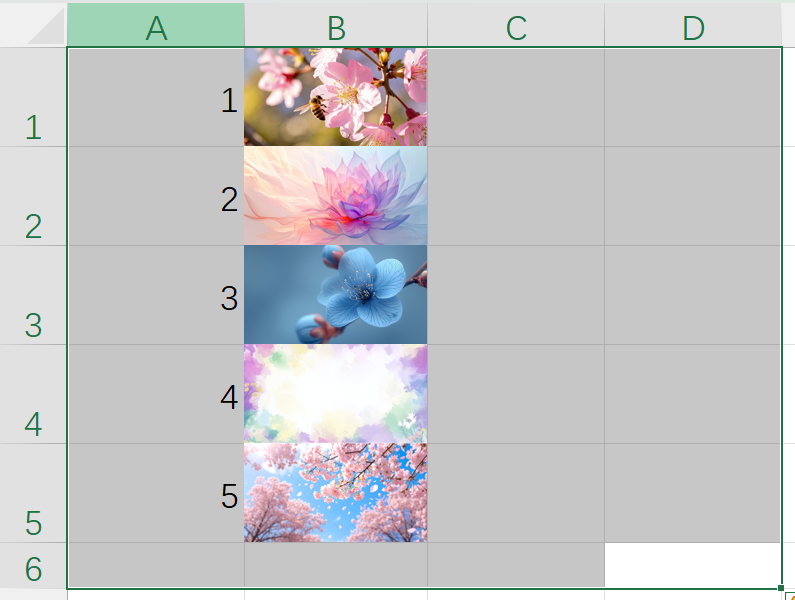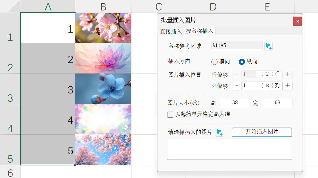 我要根据 1.png~5.png 这5个文件名进行匹配插入,那么名称参考区域就可以是A1:A5这5个单元格,输出如下: