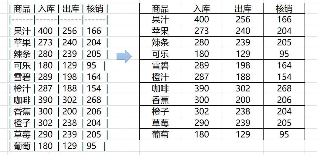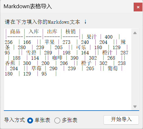 单张表:将所有Mkdown表格导入到单张工作表中,每个表格之间会有一个空行隔开多张表:每一张Mkdown表格分别放到不同的工作表中