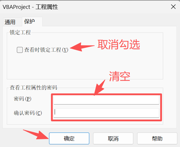 然后在对应 保护 选项卡中,取消勾选 查看时锁定工程 的复选框,同时将密码框清空,点击 确定 按钮,即可彻底解除VBA工程保护,如下图:
