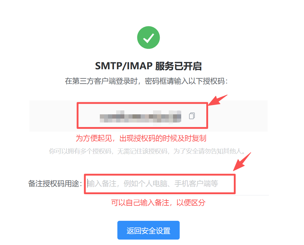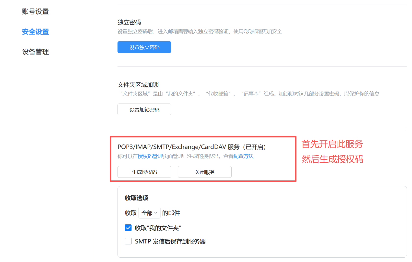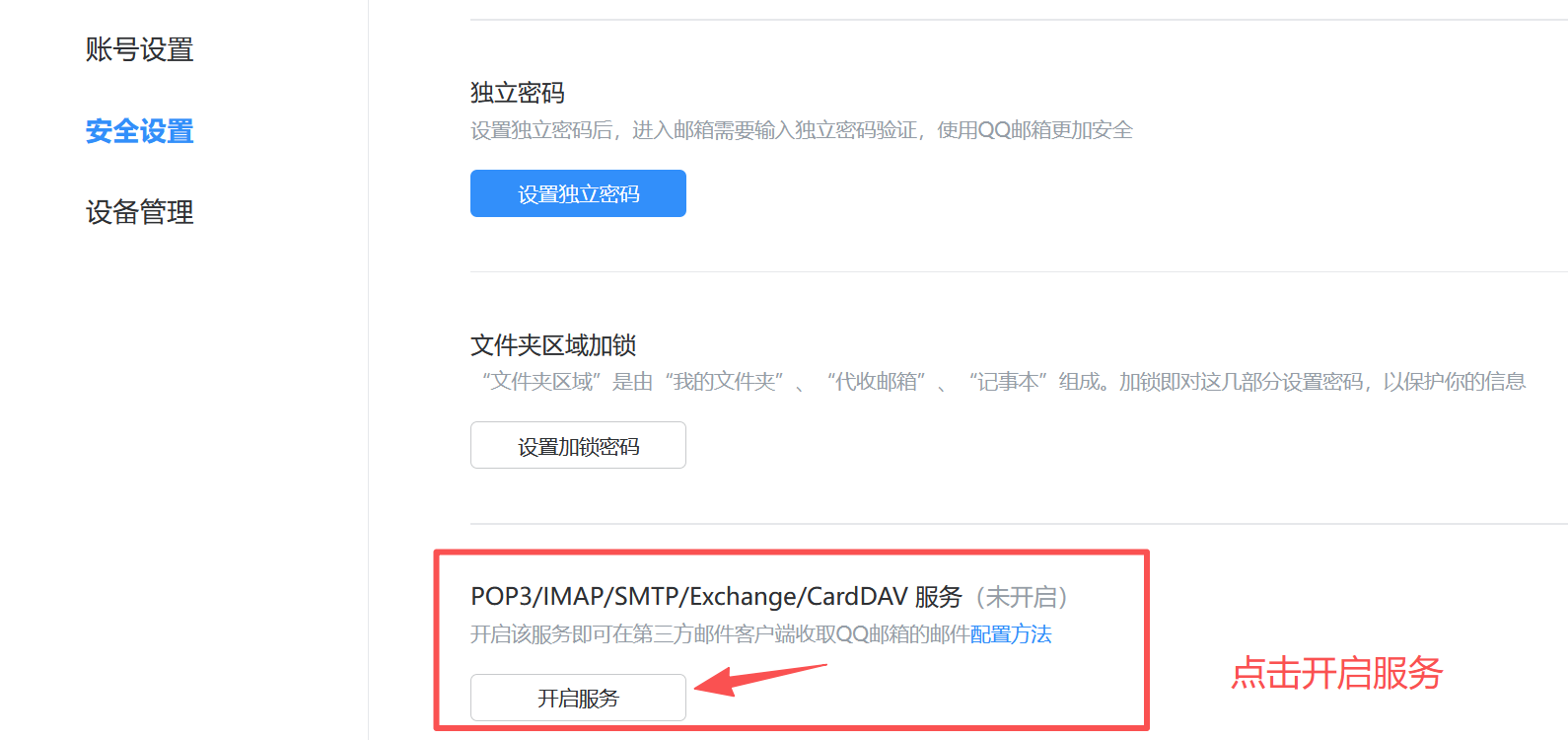 设置按钮,在账号与安全→安全设置下找到SMTP服务选项,开启此服务: