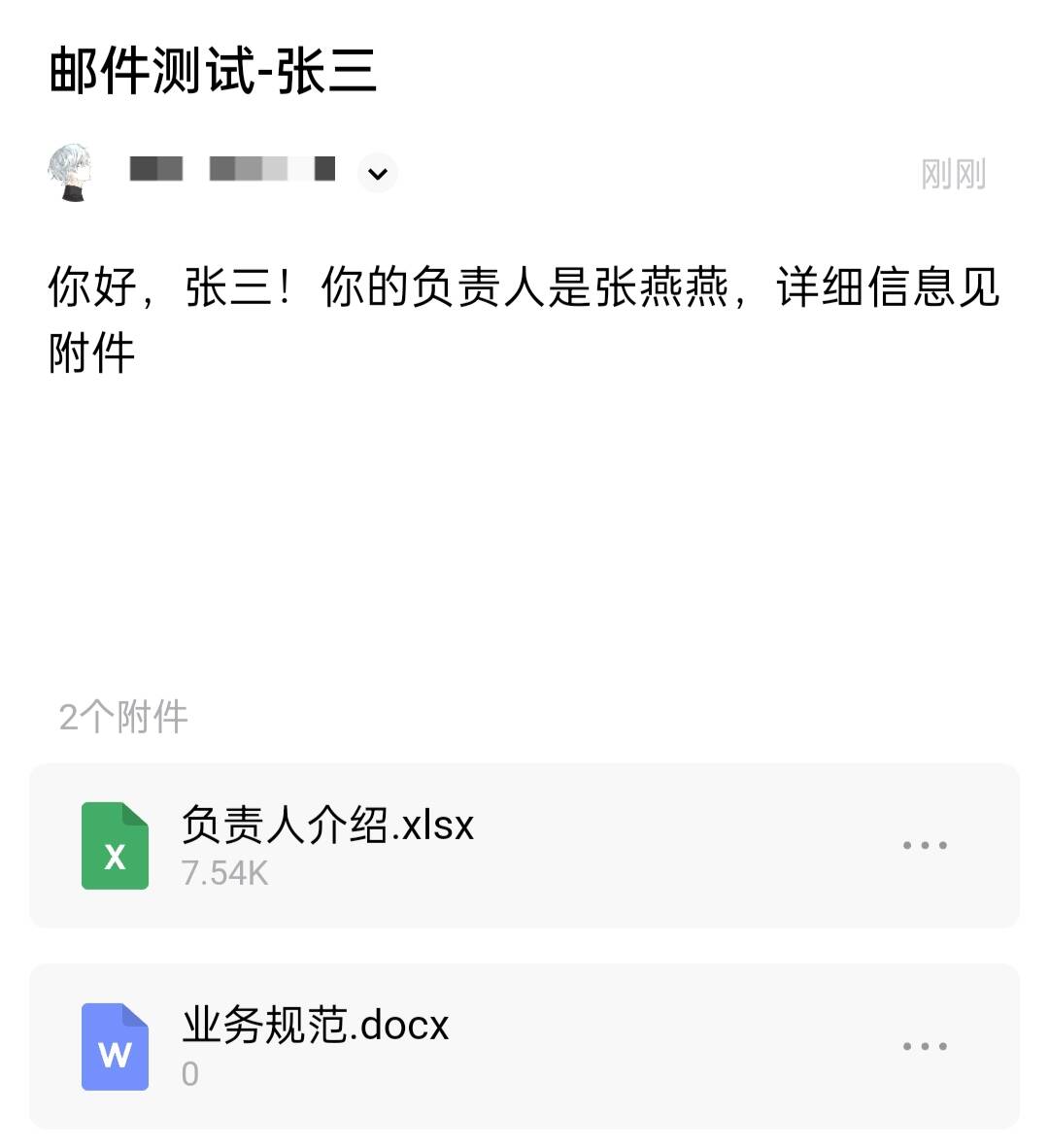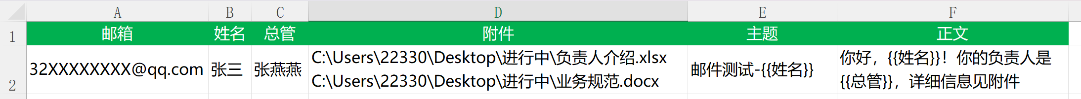 其中:邮箱列是必填的,其他列都是选填,但是注意表头"邮箱","附件","主题","正文"这四列严格按我这样命名,才能匹配到对应的值,其他列,如"姓名","主管" 都是可以自定义的,并且可以在主题,正文中通过{{姓名}},{{主管}}等占位符来引用对应的值。