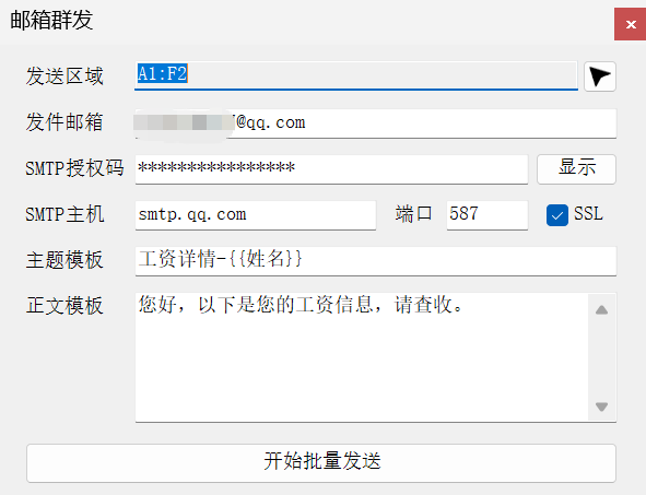发送区域:指的是你要发送的数据源区域,默认是当前选中的区域,你也可以手动指定其他区域发送邮箱:填写你自己的QQ邮箱地址SMTP授权码:填写你申请的SMTP授权码主题模板:如果你在表格区域内,没有主题这一列,可以通过在这里填写,所有邮件的主题都将统一使用此模板正文模板:如果你在表格区域内,没有正文这一列,可以通过在这里填写,所有邮件的正文都将统一使用此模板