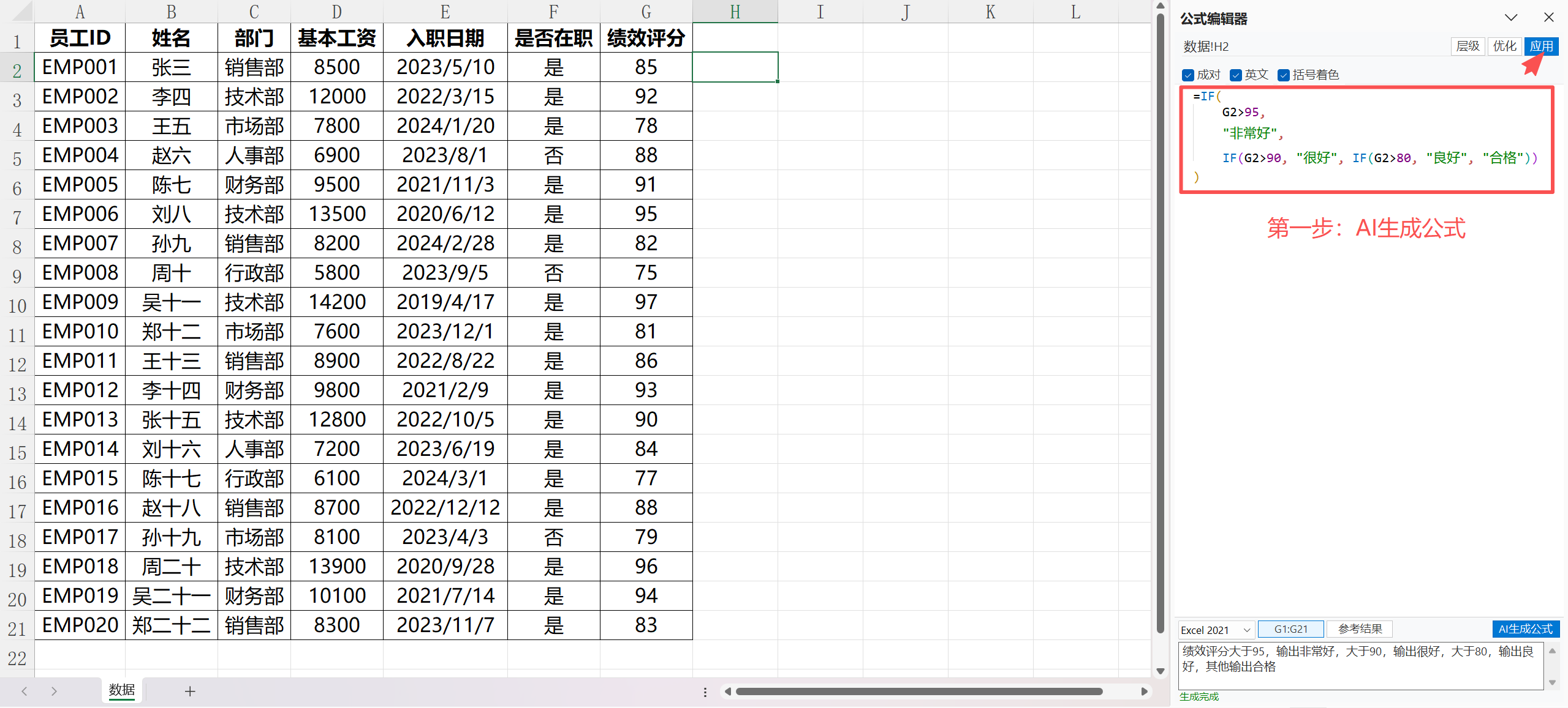 下面是一个具体的示例,一个3层的IF函数嵌套公式,1秒钟AI就拿到了结果,如下图:
