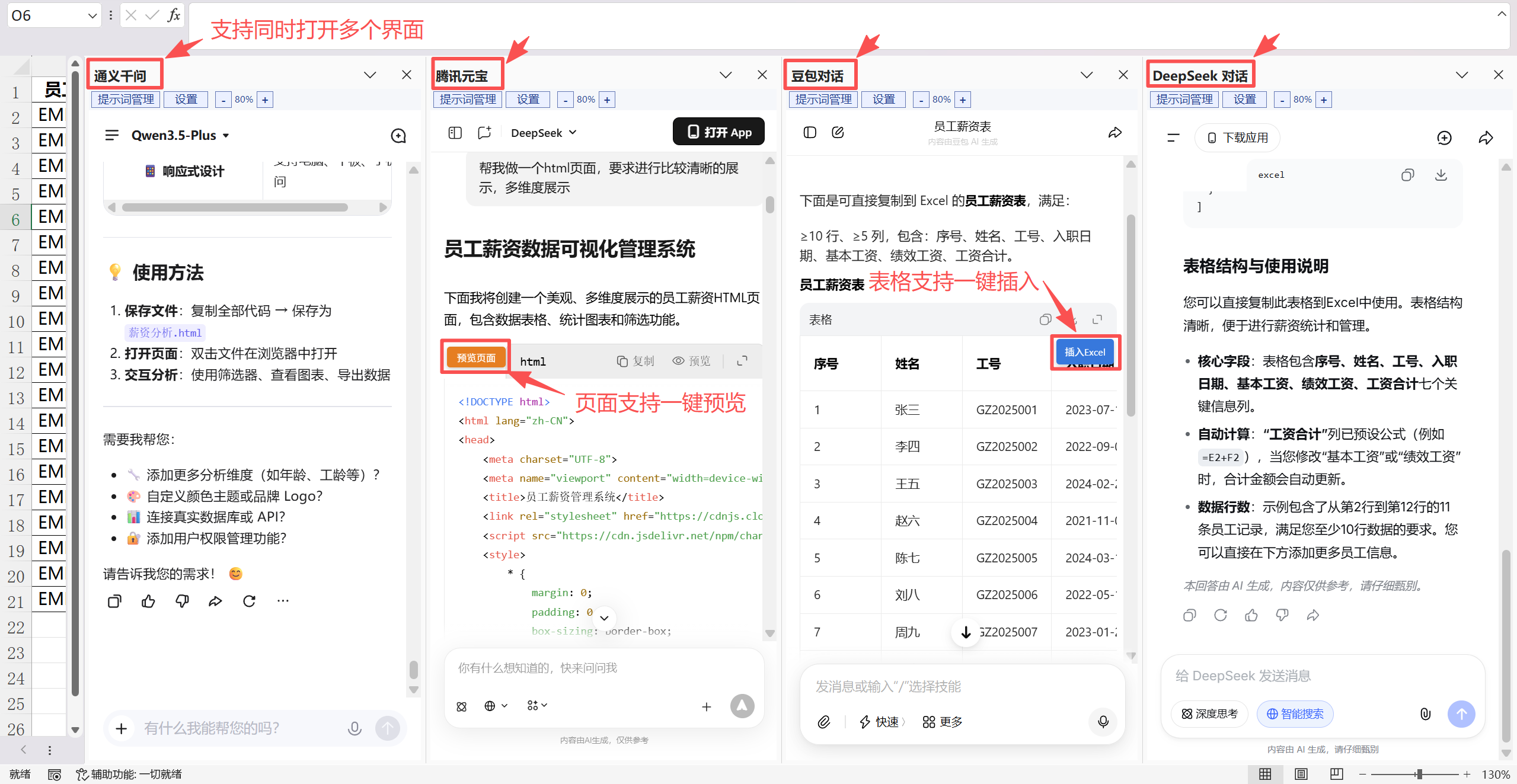在此功能下,将Deepseek等几大模型内置到EXCEL中,可以直接在EXCEL窗口中进行对话,同时:
