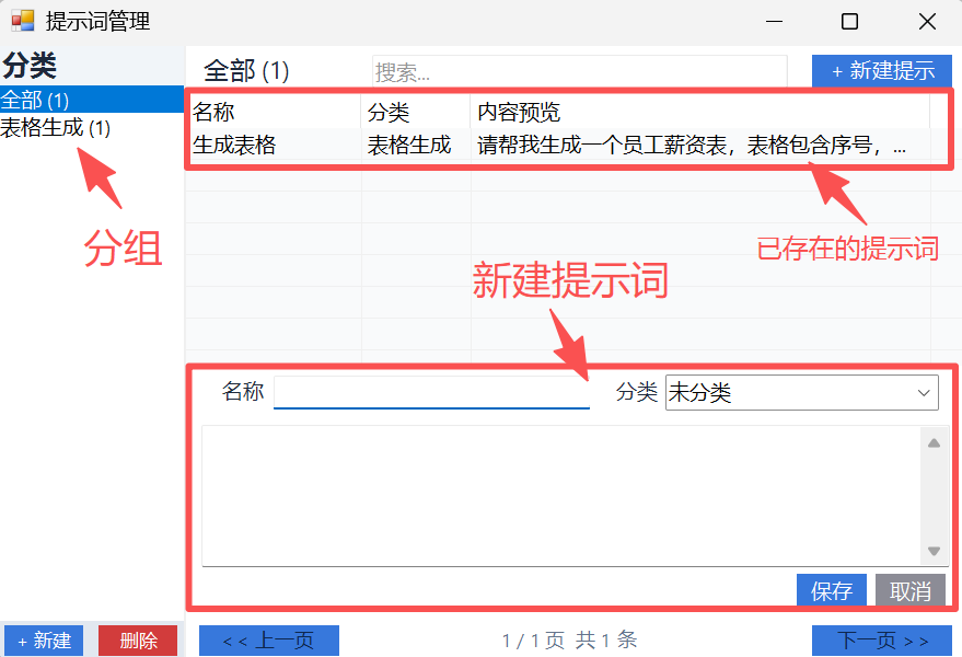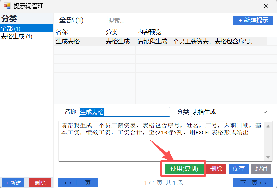 我们可以在上述界面中,很好地管理我们的提示词,包括分组,新增,删除,修改等操作,如果要使用某个提示词,直接双击即可打开详细界面,点击 使用(复制) 按钮,就可以复制到剪切板,另外如果提示词太多,也可以通过界面上的筛选功能来快速查找