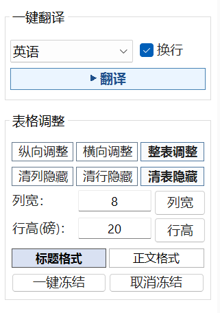 1.0.7 版本过后,增加了一键翻译功能和行高列宽调整功能,丰富的功能界面如下: