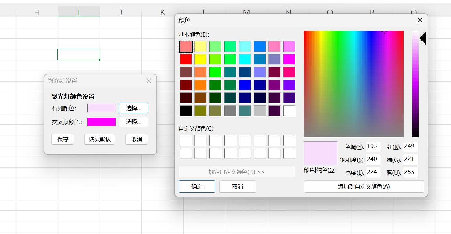 聚光灯不影响本来单元格的颜色,同时可以自定义聚光灯的颜色,具体操作如下: