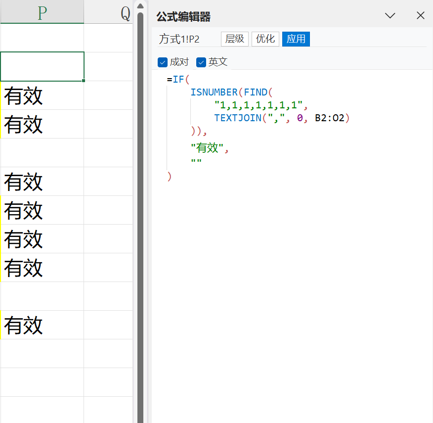 层级按钮:点击之后,对于每个函数,都会将其参数换行显示,不管面板宽度多宽优化按钮:当前公式会根据当前面板宽度自动调整,也可以通过双击Ctrl键来触发优化应用按钮:点击之后,会将当前公式应用到当前单元格,也可以通过按下Ctrl+Enter键来触发应用成对复选框:勾选之后,当你手动输入一个左括号时,会自动输入一个右括号,同时也会自动将光标移动到两个括号之间,方便你快速输入多个参数,同样也会对花括号,引号等成对出现的字符进行处理英文复选框:勾选之后,你输入的中文逗号,中文引号等会自动转换为英文逗号,英文引号,减少语言切换的麻烦括号着色复选框:勾选之后,会将公式中的括号进行着色,方便你快速识别括号的层级(1.0.5更新)