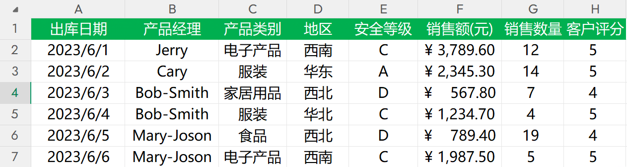| 产品经理 产品类别 地区 安全等级 销售额(元) 销售数量 客户评分 性能