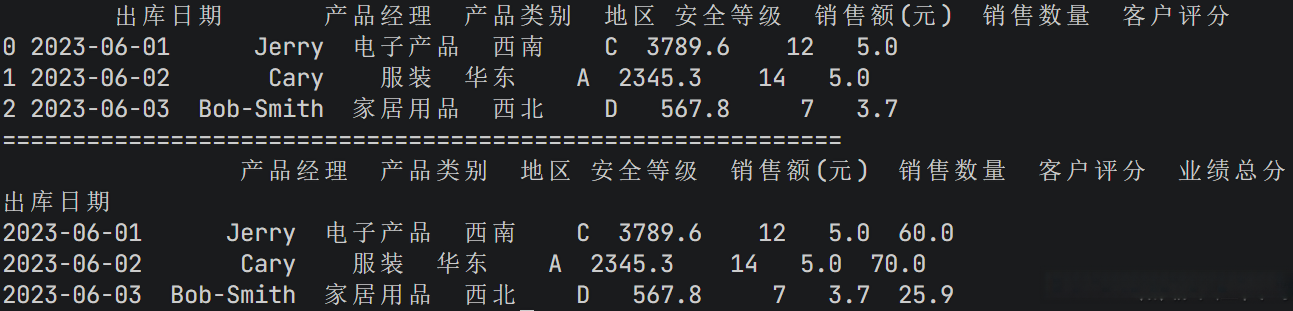 输出如下,可以发现运算过后,最后多了一列业绩总分,也就是成功新增了一列: