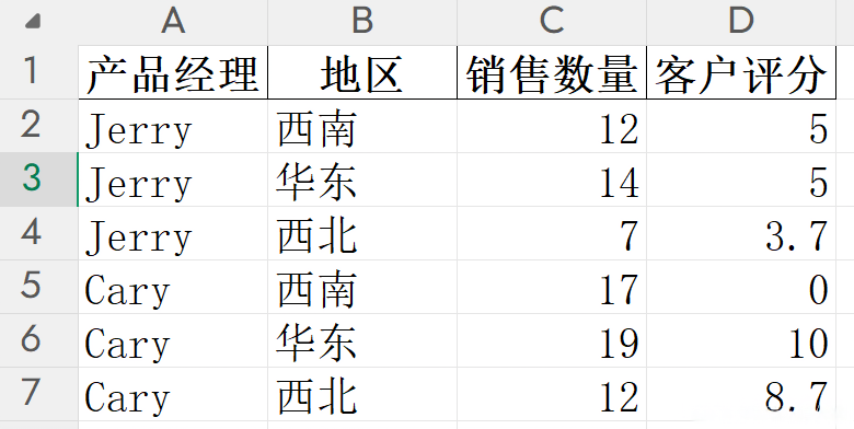 | Unnamed: 0 产品经理 地区 销售数量 客户评分