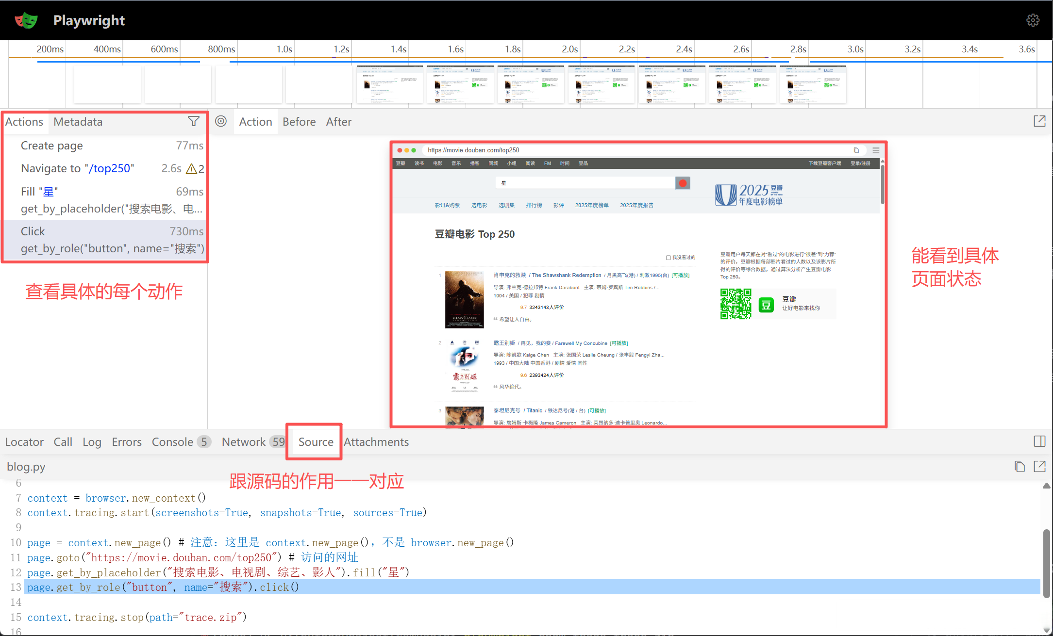screenshots=True,启用截图记录,在测试执行的每个步骤自动捕获屏幕截图snapshots=True,启用快照记录,记录 DOM 快照,包括页面结构、元素状态等sources=True,启用源代码记录,方便后续动作和代码一一对应