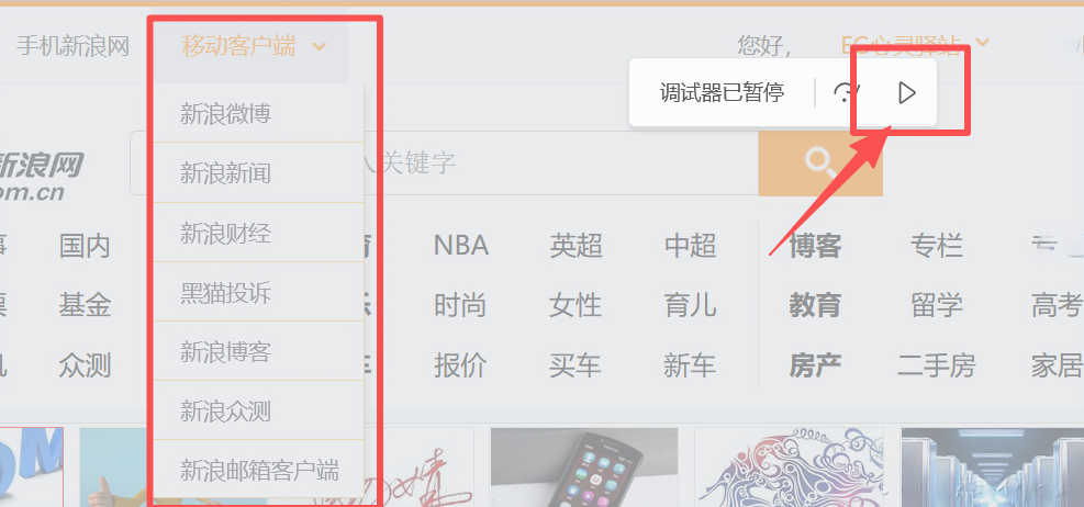 最后说一个检查的技巧,页面上有些元素是在其他元素hover的时候才进行显示,这个时候我们可以在控制台(Console)去输入debugger 或者 延时debug setTimeout(function(){debugger}, 3000) 进入调试模式,冻结页面,这样我们就能更方便地定位这些在特定场景下才显示的内容,比如下方的这个界面,下拉菜单只在鼠标悬浮在“移动客户端”上才进行显示