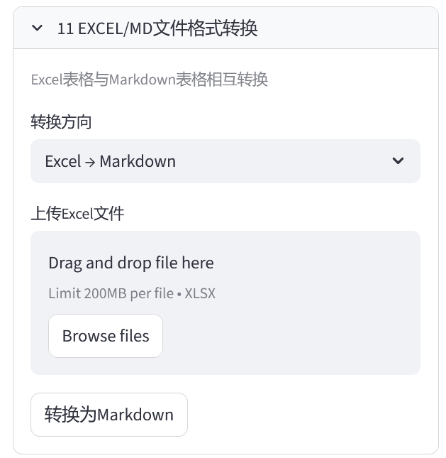 Excel工具(11-20)¶ 11 Excel文件和md文件转换¶ 在这个选项卡下,实现了将Excel文件和md文件的互相转换,具体效果如下: 具体功能界面如下: 操作步骤: 选择转换模式,Excel转md文件时,选择“Excel → Markdown”,md文件转Excel时,选择“Markdown → Excel” 点击“选择文件”按钮,选择要转换的文件 点击“转换”按钮,即可完成转换,随后下载即可
